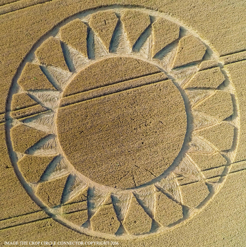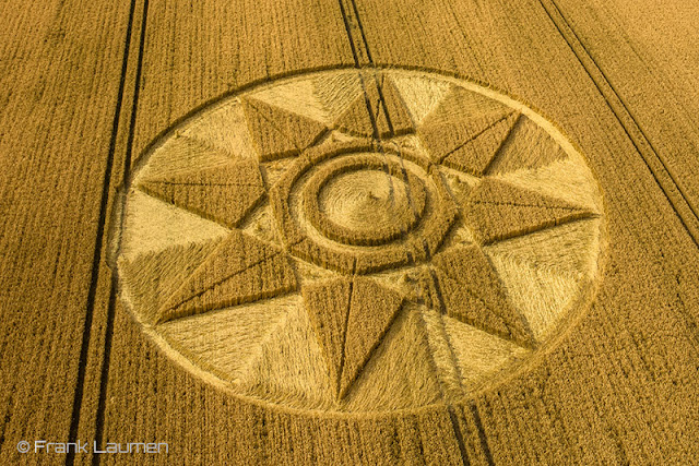 We werden vervolgens in vervoering gebracht toen een andere ongelooflijke formatie een paar dagen later verscheen op 30 Juli. Het was gecreëerd met 20 punten in een zeer ongebruikelijk omgekeerd sterrenpatroon. Ik vind het echt interessant dat de punten naar binnen naar de grote bol stralen. Ik voel dat de punten verbinden met de 20 heilige dagen (perspectieven - persoonlijkheden) van de Maya kalender. Deze 20 heilige dagen representeren de kern van onze programmering (routines en gewoontes), onze persoonlijkheid (hoe wij de wereld gewaarworden/waarnemen) en bestemming (ons ziel doel). Dus … vroeg ik hiernaar, en ik ontving een volgende korte boodschap. Aan mij werd getoond dat de bol onze Aarde was, en aan ons werd verteld dat het NU in het proces is van een gigantische en ongelooflijke toevoer van krachtige en transformerende energie en LICHT te ontvangen. Maar wat zelfs meer opwindend was is, dat aan mij getoond werd dat een krachtige binnenwaartse portaal gecreëerd werd (een wormgat in tijd en ruimte van de één of andere soort) waar doorheen de Aarde en de Mensheid zullen passeren. Dit is het begin van wat zou kunnen zijn een 180 graden verschuiving van waarop de massale populatie op vele manieren de dingen doet, en hoe zij de wereld om hen heen waarnemen/gewaarworden. Die mensen die het gevoel hebben dat hun taak voorbij en gedaan was, zouden heel goed nieuwe, geëvolueerde taak omschrijvingen en een nieuw boost kunnen krijgen richting zelfs hogere doelstellingen.